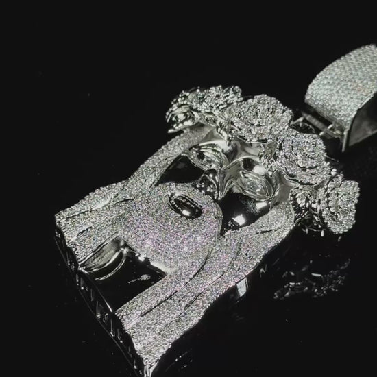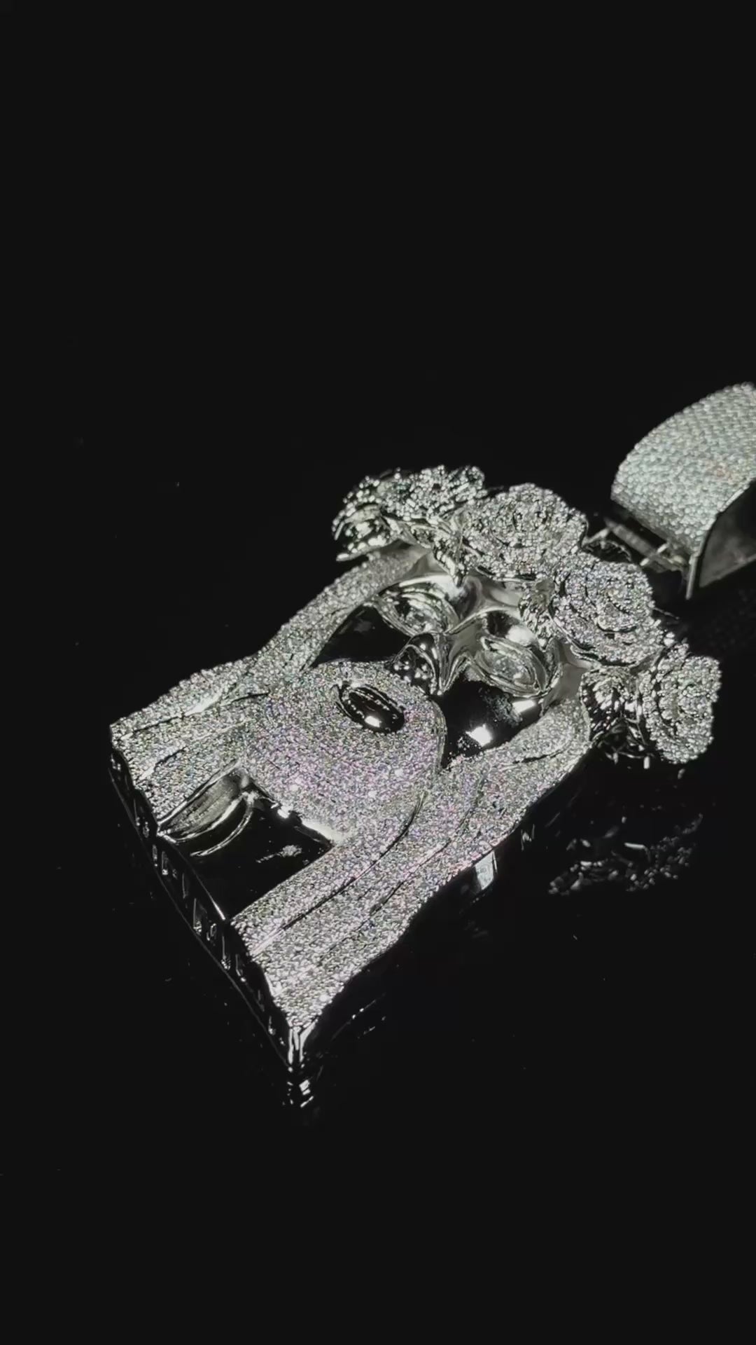 Fabricado en acero inoxidable 316L y recubierto con un baño de oro blanco real de 18 quilates, su diseño tridimensional está completamente engastado a mano con circonitas 5A+ que capturan la luz con cada movimiento.