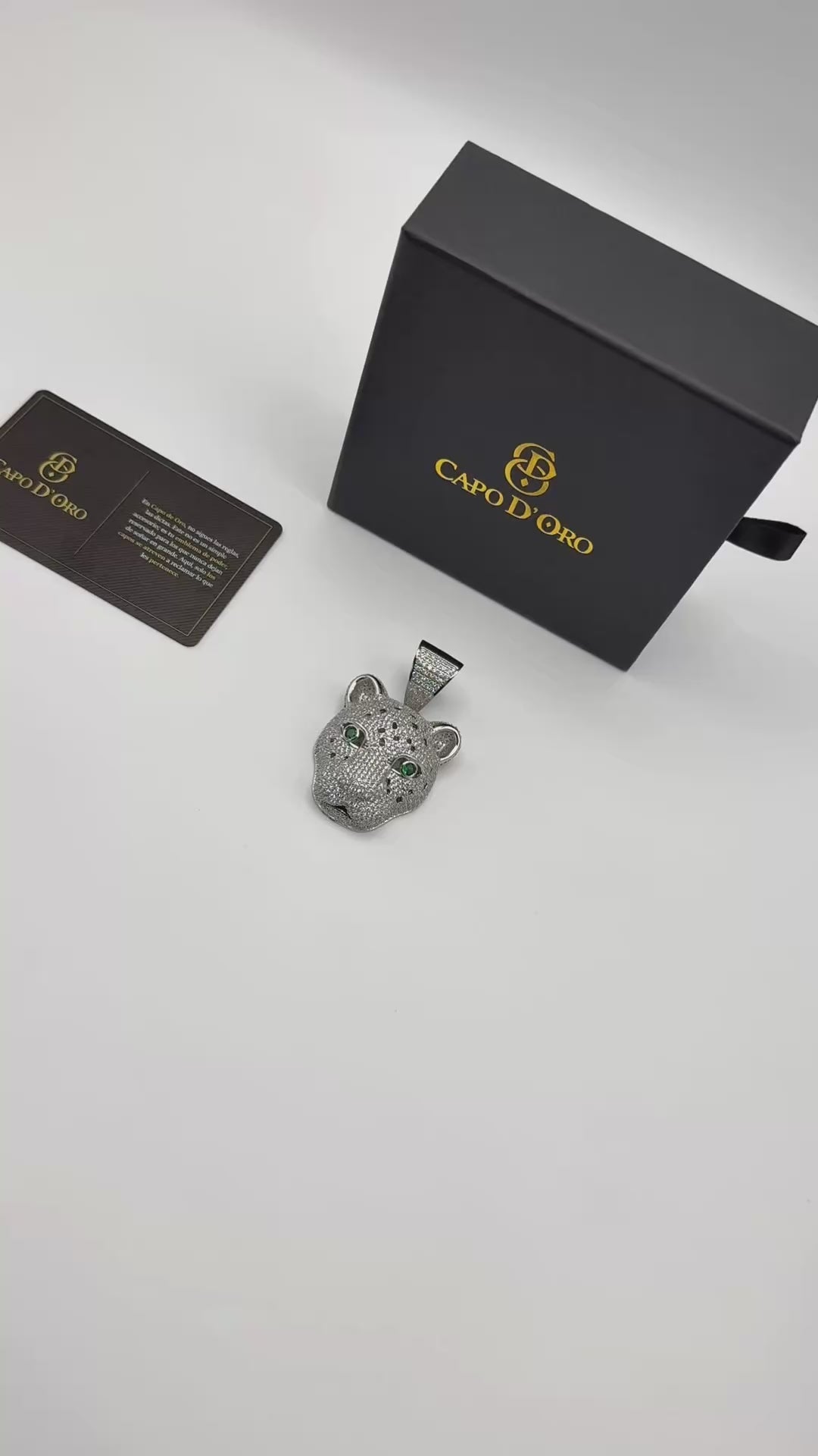 The Imperial Leopard Pendant from Capo de Oro is a piece of jewellery that embodies strength and luxury. Featuring a leopard head meticulously adorned with pavé-set sparkling zirconia and green eyes that capture the gaze, this piece reflects the power of bold elegance. Gold-plated and flawlessly finished, the Imperial Leopard is the perfect accessory for those seeking a symbol of unrivalled status and style. Wear it and show off your fiercest and most sophisticated side.