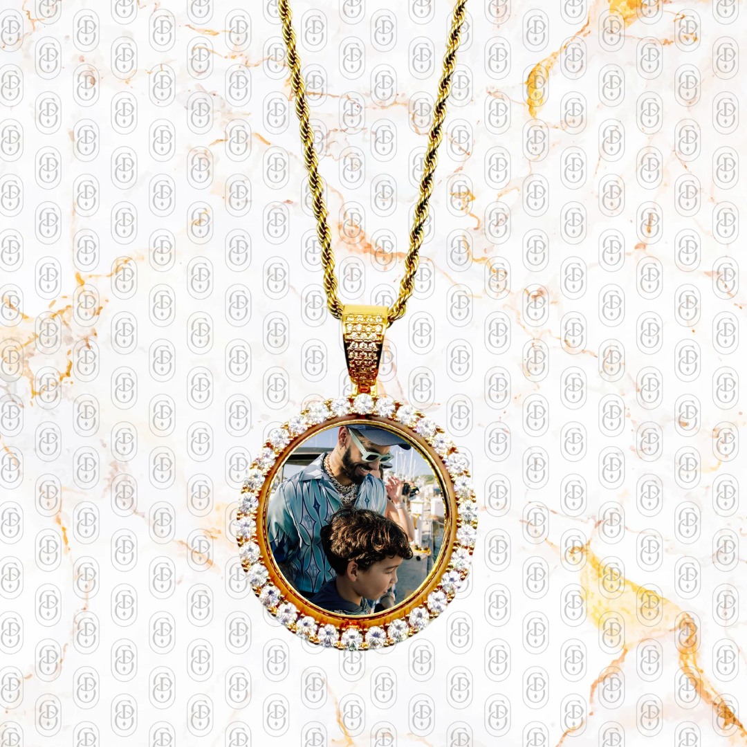 El “Legacy Frame” es un colgante pensado para capturar tus mejores momentos y convertirlos en un ícono de estilo. Con un diseño circular elegante y moderno, esta pieza se destaca por su borde engastado en piedras tipo diamante que rodean tu imagen especial, creando un marco de lujo y brillo sin igual.