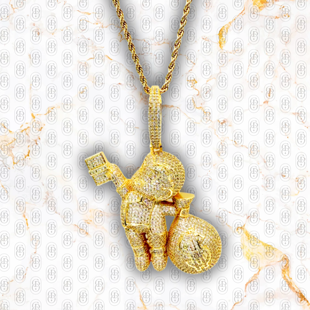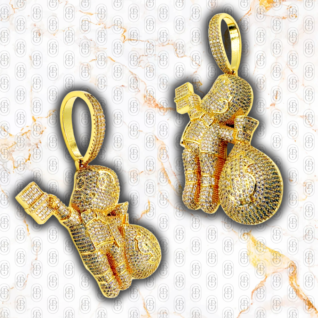 Mr. Gold sostiene un fajo de billetes verdes mientras arrastra un saco de dinero completamente cubierto en gemas, con el símbolo del dólar en negro profundo, evocando poder financiero y estilo dominante. Cada centímetro de esta joya ha sido diseñado para capturar miradas y hablar el lenguaje silencioso del éxito.