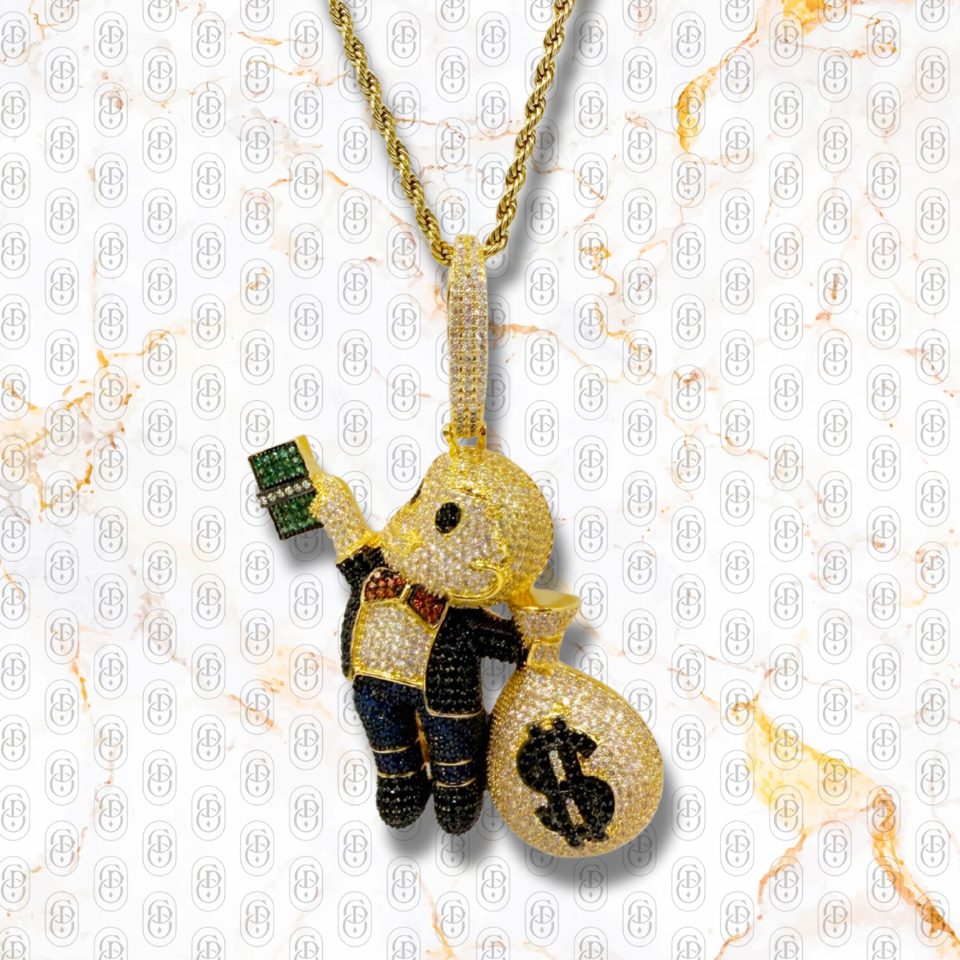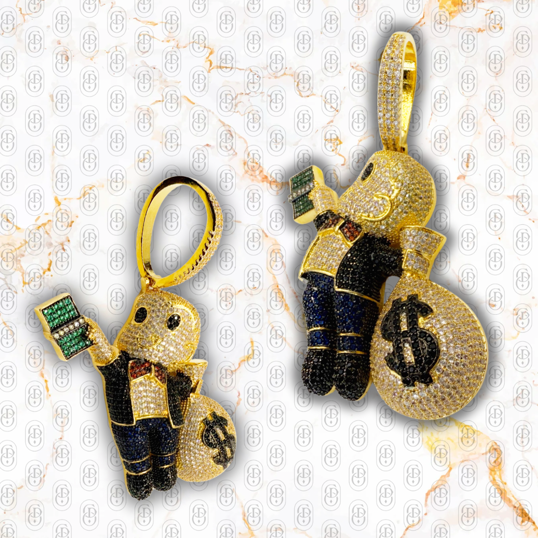 Mr. Gold sostiene un fajo de billetes verdes mientras arrastra un saco de dinero completamente cubierto en gemas, con el símbolo del dólar en negro profundo, evocando poder financiero y estilo dominante. Cada centímetro de esta joya ha sido diseñado para capturar miradas y hablar el lenguaje silencioso del éxito.