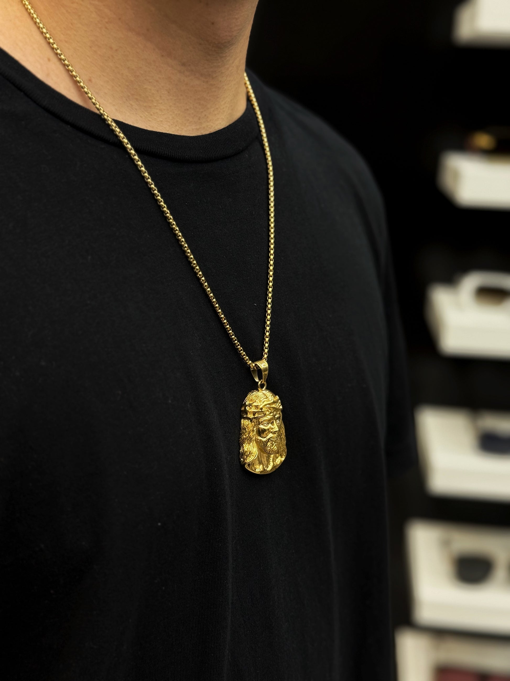 Fabricado por manos expertas en joyería sólida, cada detalle de esta pieza fue esculpido con precisión para representar no solo una imagen sagrada, sino también el símbolo de protección y liderazgo que acompaña a quien lo porta. El acabado dorado espejo le da un brillo dominante, digno de quien está en la cima.