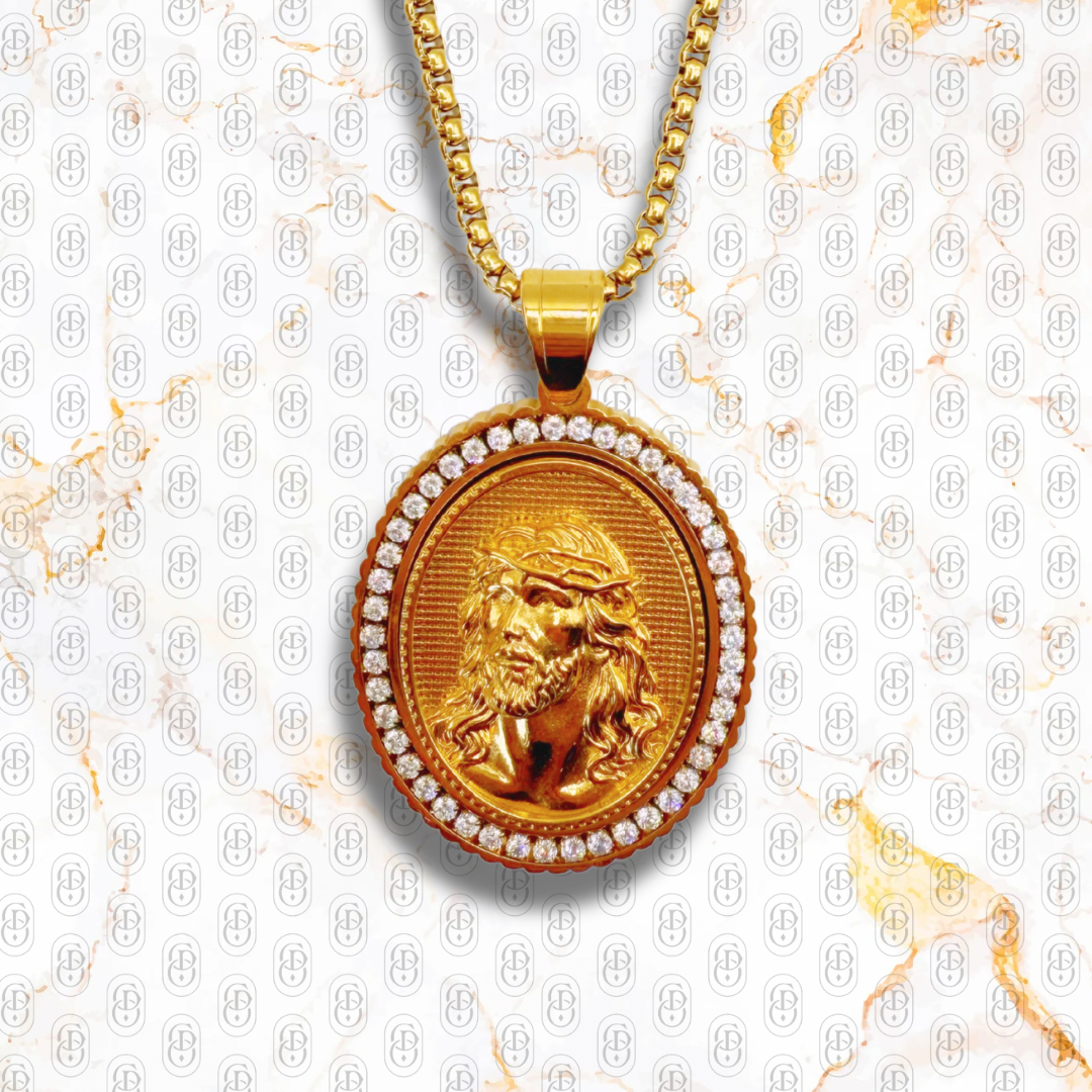 Inspirado en la fe, el respeto y el legado de quienes llevan sus creencias como estandarte, Il Redentore es una pieza que representa fuerza espiritual con una presencia visual imponente. Este colgante en acabado oro sólido presenta el rostro detallado de Jesús con corona de espinas, tallado en alto relieve, rodeado por un halo de circonias que simulan diamantes con un destello hipnótico y celestial.