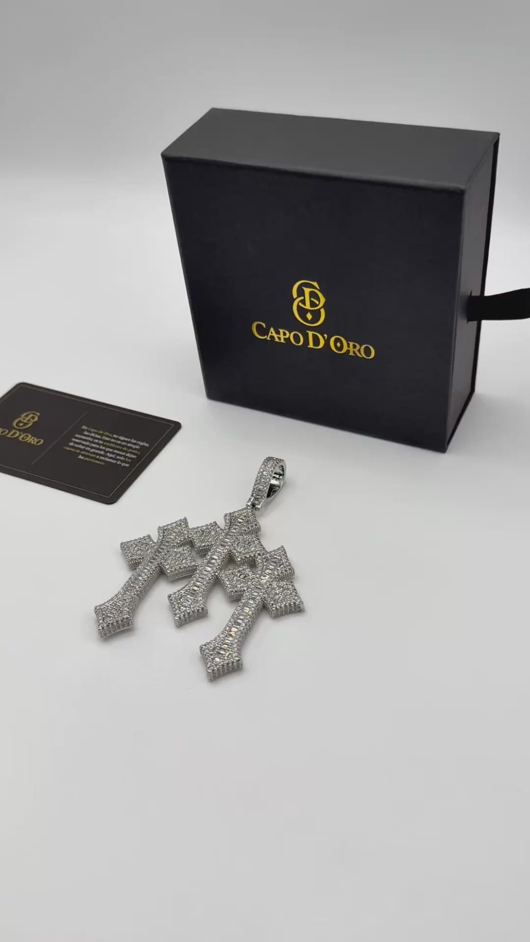 Trinità Silver by Capo de Oro is a jewel that defines sophistication and luxury in every detail. With three crosses carefully embellished with baguette-cut cubic zirconia, this silver-finished pendant reflects the light with an unmatched radiance. Designed for those who appreciate the power of elegance, the Trinità Silver is the perfect accessory to make a statement and make a statement on any occasion.