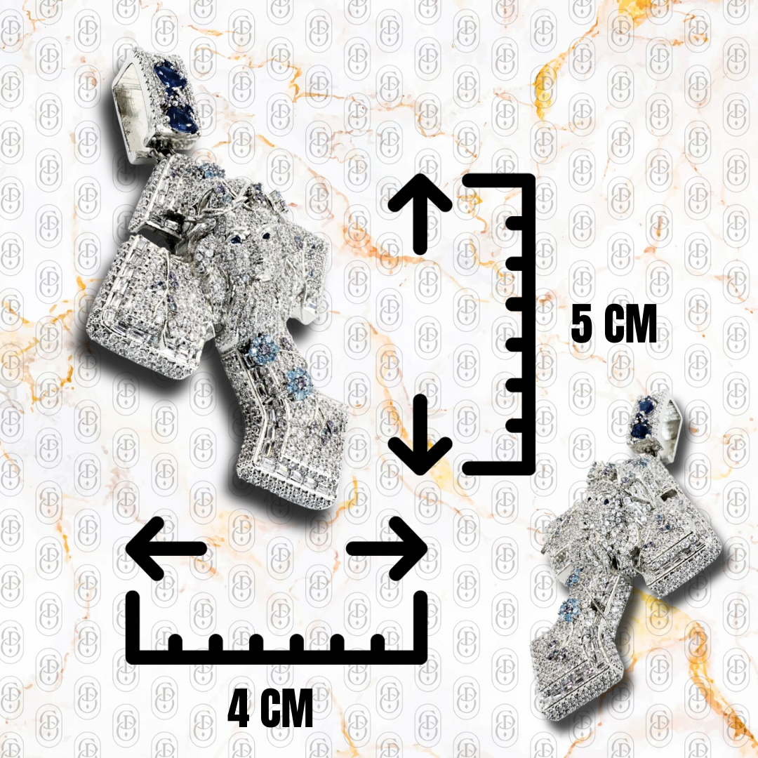 Fabricado en acero inoxidable 316L y chapado en oro blanco premium, este colgante destaca por sus circonitas 5A+ engastadas una a una, incluyendo sutiles tonos azules que realzan la profundidad del diseño. El brillo, la textura y la composición tridimensional convierten esta pieza en un símbolo de fe, arte y distinción pensado para quienes aprecian la excelencia sin necesidad de pagar precios inaccesibles.