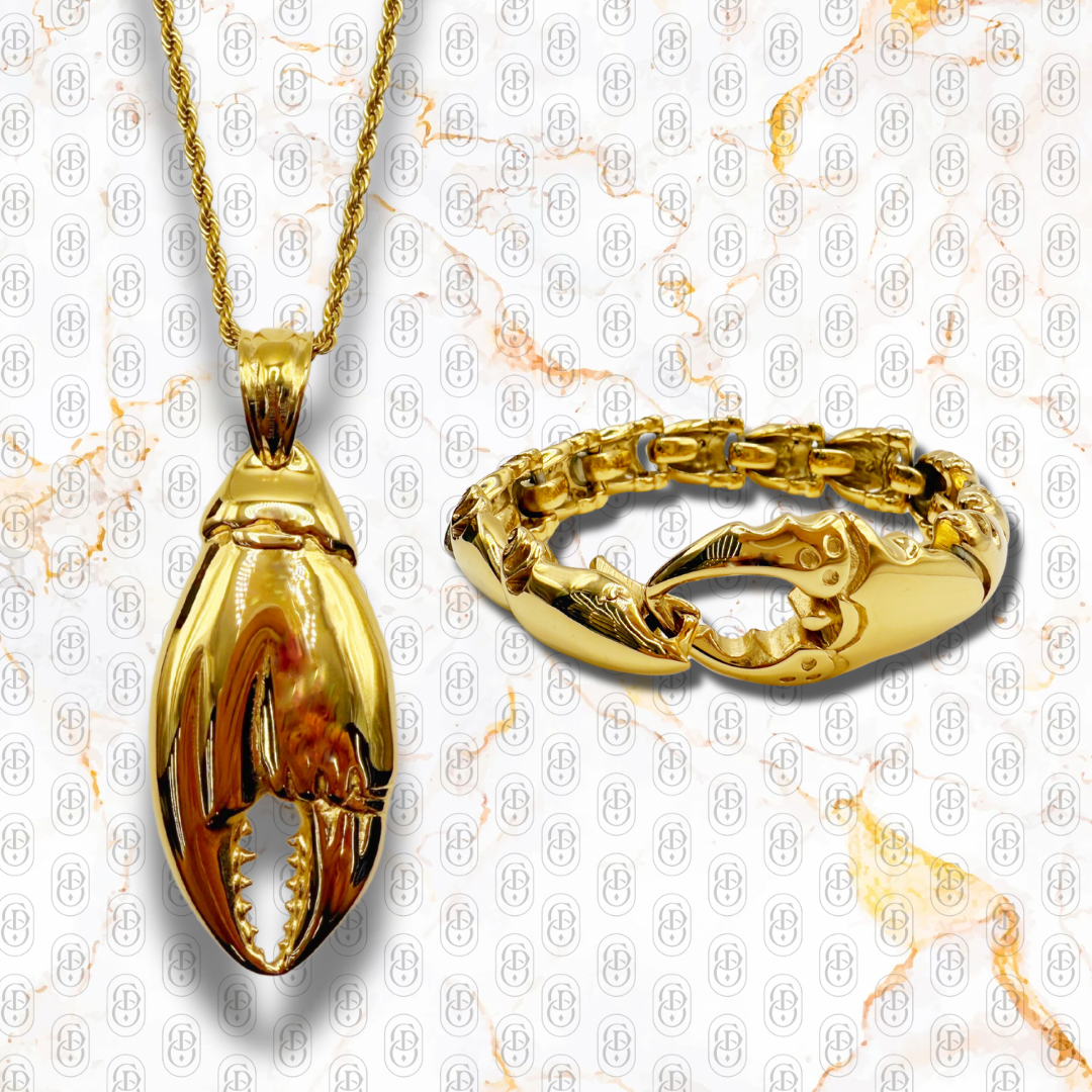 Diseñado para quienes dominan las profundidades con estilo. El set Golden Crab —colgante y brazalete— representa fuerza, protección y precisión, inspirado en la anatomía poderosa de la pinza del cangrejo imperial.