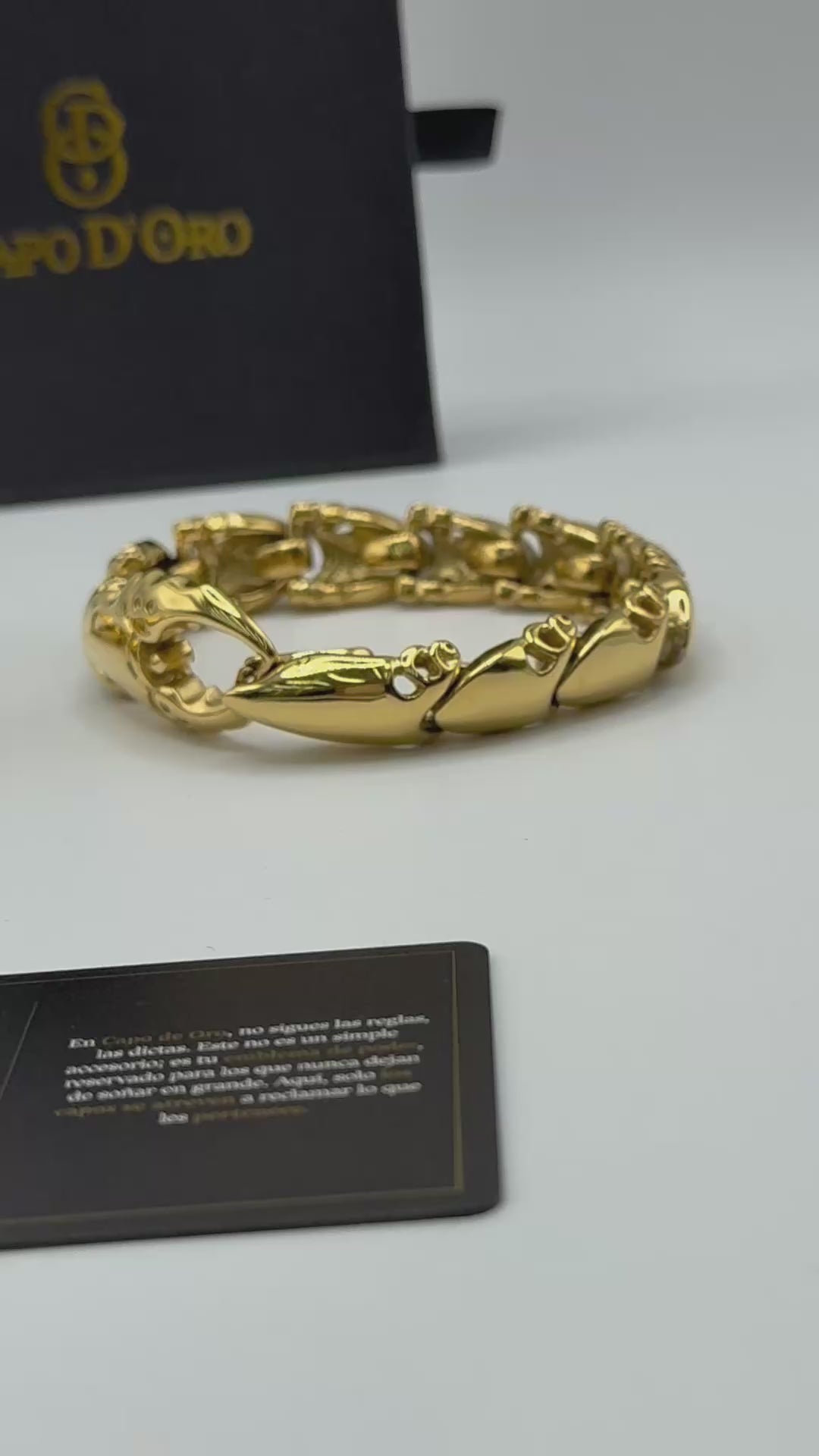 Cada pieza está fundida en acero quirúrgico 316L con acabado en oro de 18 quilates mediante baño iónico de alta adherencia, asegurando resistencia al desgaste y una apariencia que permanece impecable.