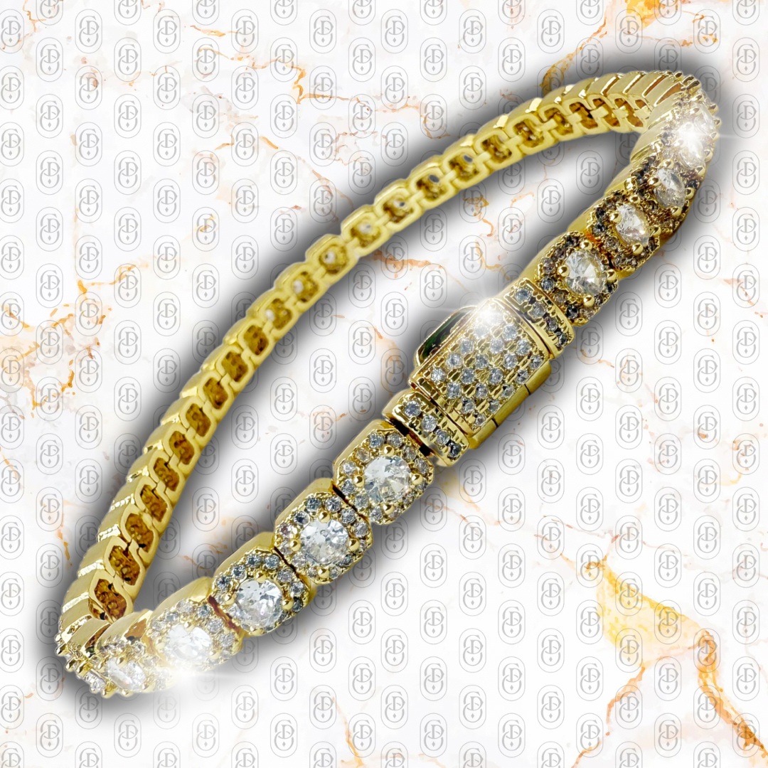 El Imperatore Lux es la máxima expresión del lujo y la exclusividad. Fabricado en acero inoxidable de alta resistencia y chapado en oro de 18K, este brazalete resalta por su diseño sofisticado y su brillo incomparable. Cada eslabón está engastado con circonitas cúbicas 5A, con un juego de tamaños estratégicamente dispuestos para maximizar el reflejo de la luz y elevar su presencia a otro nivel. Su broche de caja ultra seguro, decorado con micro circonias, garantiza un ajuste perfecto con un acabado impecable. Un símbolo de poder, éxito y ambición.