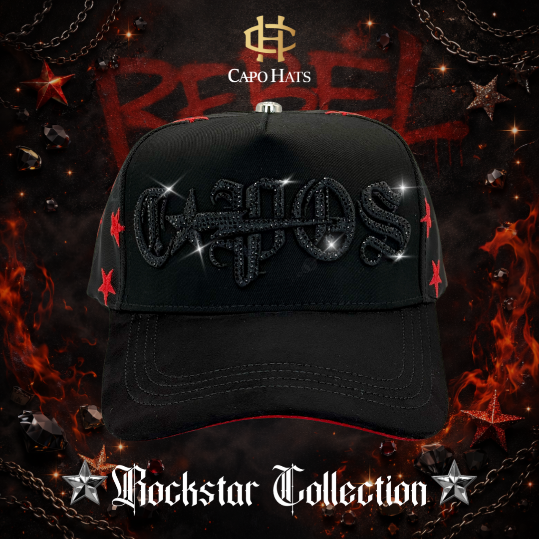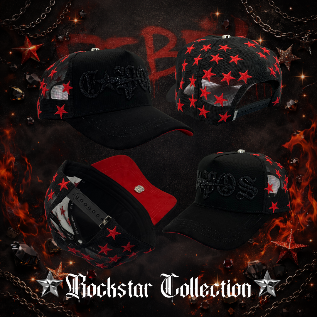 - Bordado frontal “CAPOS” en microbordado de alta precisión, rodeado de pedrería negra con acabado brillante para un efecto sofisticado y profundo.