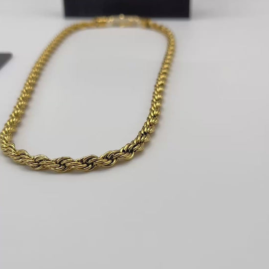 Su diseño rope de 6mm, con eslabones trenzados de precisión, genera un brillo intenso que no pasa desapercibido. Fabricada en acero inoxidable 316L de alta resistencia y chapada en oro auténtico de 18 quilates, esta cadena está hecha para acompañarte en cualquier ocasión, con la seguridad de que mantendrá su presencia impecable.